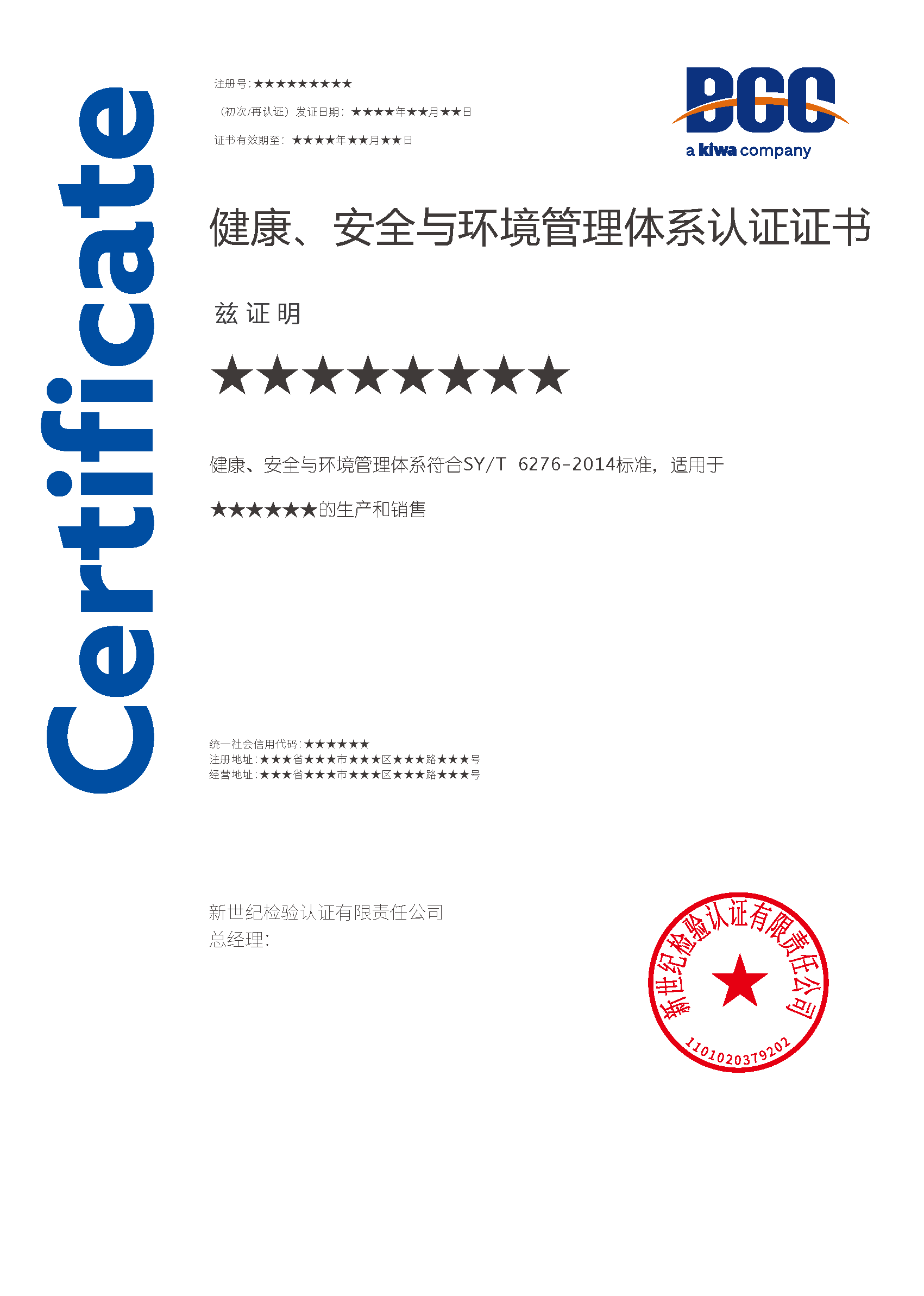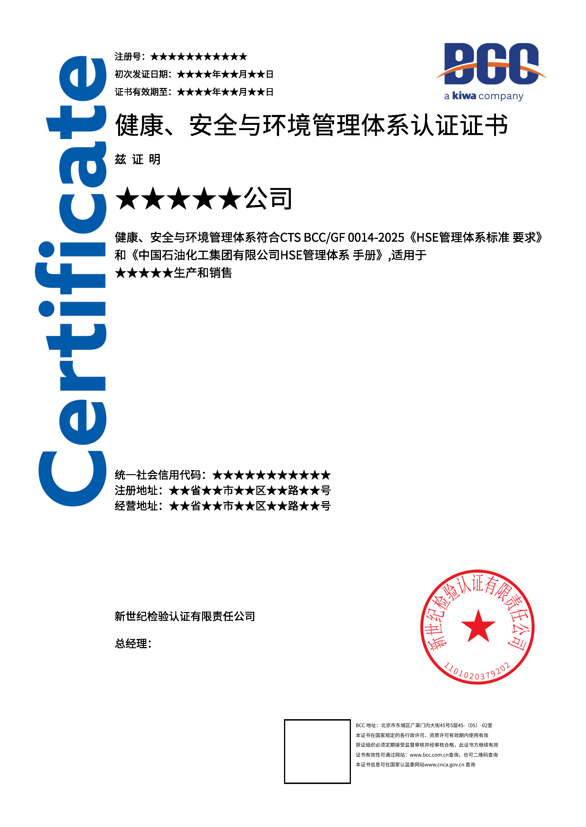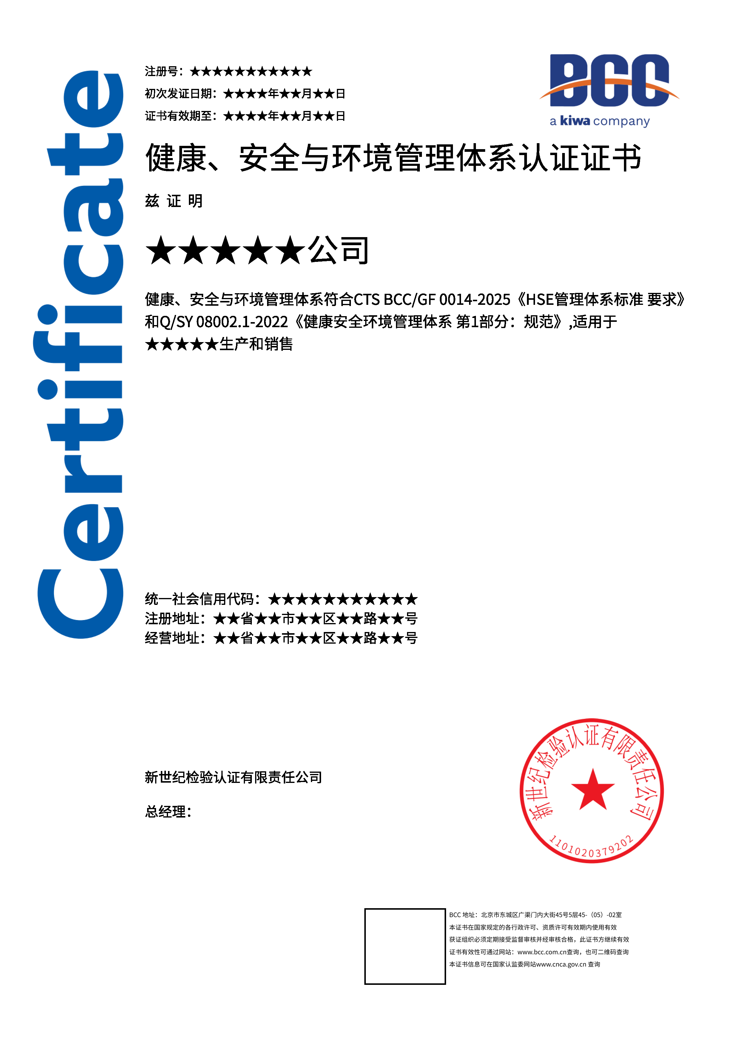 本頁涉及的認證服務中均有對應的《認證實施規則》,BCC擁有其最終解釋權。任何組織及個人未經BCC許可,不得以任何形式全部或部分使用(法律要求除外)認證相關信息。如需獲取相關實施規則請用以下方式聯系獲取:電話:010-58579316 郵箱:fwjs@kiwa.cn