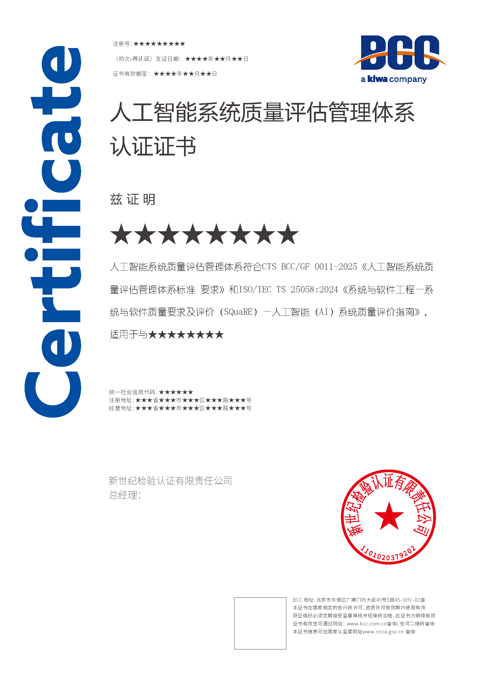 本頁涉及的認證服務中均有對應的《認證實施規則》,BCC擁有其最終解釋權。任何組織及個人未經BCC許可,不得以任何形式全部或部分使用(法律要求除外)認證相關信息。如需獲取相關實施規則請用以下方式聯系獲取:電話:010-58579316 郵箱:fwjs@kiwa.cn