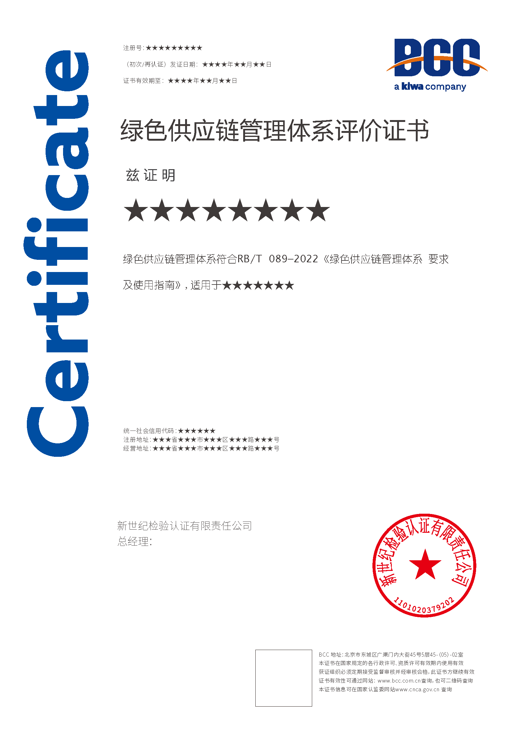 本頁涉及的認證服務中均有對應的《認證實施規則》,BCC擁有其最終解釋權。任何組織及個人未經BCC許可,不得以任何形式全部或部分使用(法律要求除外)認證相關信息。如需獲取相關實施規則請用以下方式聯系獲取:電話:010-58579316 郵箱:fwjs@kiwa.cn