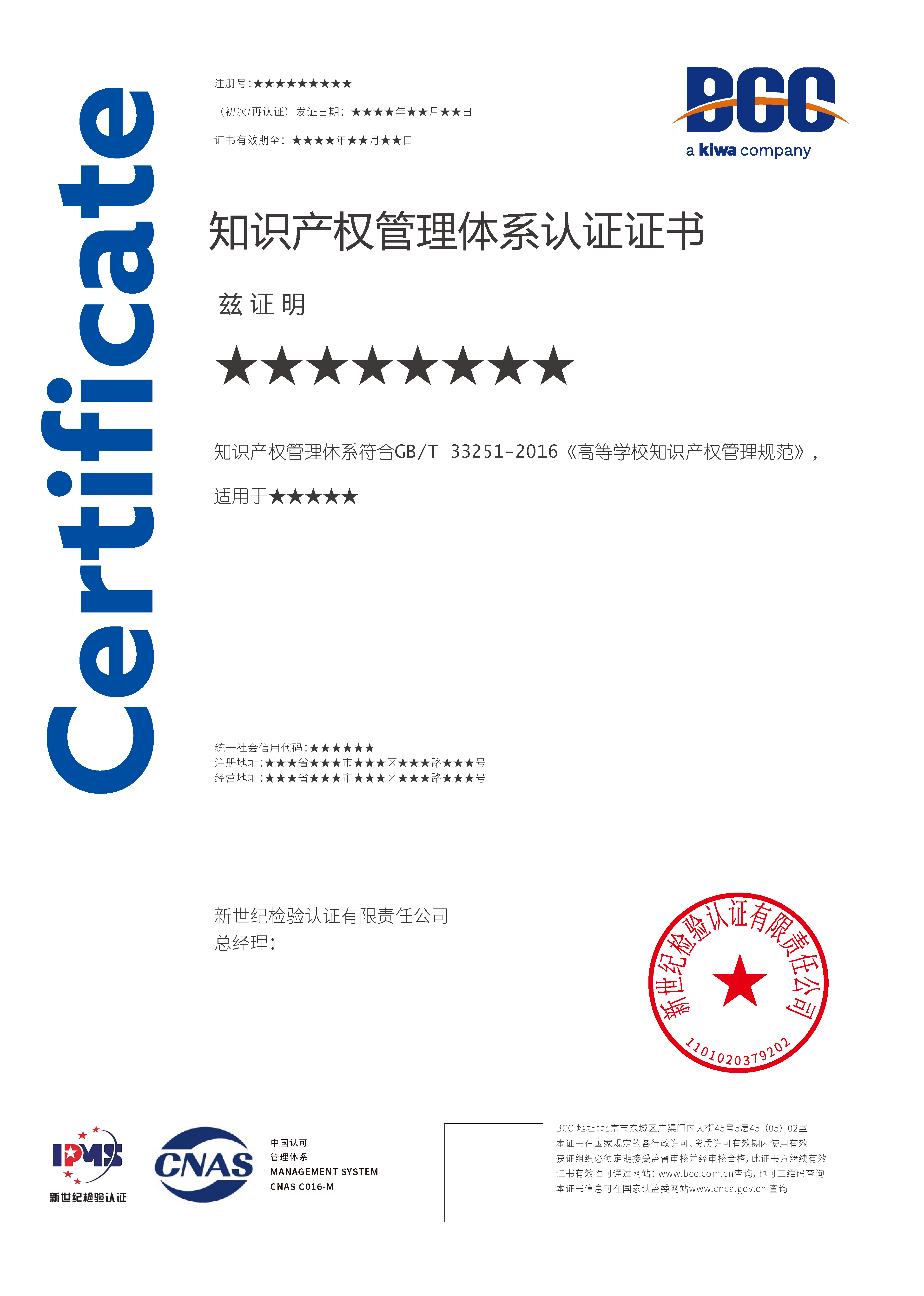Kiwa BCC是首批獲CNAS認可的知識產權認證機構,可為企業頒發帶有“CNAS”標識的知識產權管理體系認證證書。認證所用標準包括:GB/T 29490-2023《企業知識產權合規管理體系要求》、GB/T33250-2016《科研組織知識產權管理規范》、GB/T33251-2016《高等學校知識產權管理規范》。